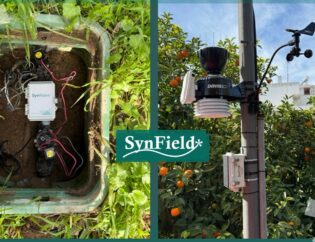 With this setting, the SynField application can collect data not only regarding the weather conditions, but also the leaf wetness, water flow rate in the drip lines along the farm and the soil moisture in several disperse locations in the farm (each connected soil moisture cable length is about 30 meters in order to collect measurements from different locations with different soil electric conductivity values).